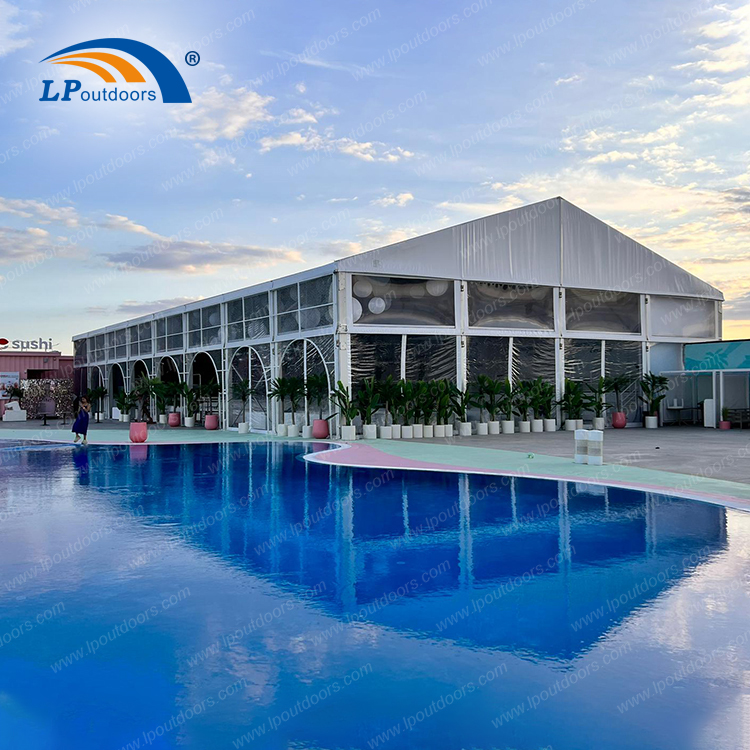Nossa barraca grande de 20 × 40 metros de largura, com uma altura lateral de 6 metros, fornece aos nossos clientes um local de atividades por uma piscina. Com sua estrutura de alumínio de alta resistência e design elegante da janela lateral, esta barraca é um local ideal para casamentos, celebrações, eventos esportivos e assim por diante.